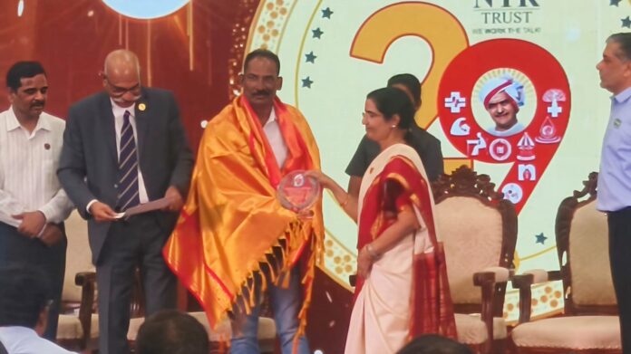 హైదరాబాద్ లో శనివారం జరిగిన ఎన్ టి ఆర్ ట్రస్ట్ 29 వ ఫౌండేషన్ డే లో విశాఖపట్నం పెద జాలరిపేట కు చెందిన ఒలిశెట్టి గురునాధ్ ను ఆంధ్రప్రదేశ్ ముఖ్య మంత్రి చంద్రబాబు సతీమణి నారా భువనేశ్వరి ఘనంగా సన్మానించారు కొన్ని సంవత్సరాలుగా 72 బ్లడ్ క్యాంపులు, 12 ఉచిత వైద్య శిబిరాలు నిర్వహించి 95 సార్లు రక్తదానం చేసిన గురునాధ్ సేవల్ని ఎన్ టి ఆర్ ట్రస్ట్ అభినందించింది బ్లడ్ బ్యాంకు ను సొంతంగా ఏర్పాటు చేసి వేలాదిమందికి రక్తం అవసరాలకు అందించి ప్రాణాలు కాపాడిన గురునాద్ గొప్ప సంస్కారణీయుడని వక్తలు కొనియాడారు ఈ కార్యక్రమం లో విశాఖ తూర్పు ఎమ్మెల్యే వెలగపూడి రామకృష్ణ బాబు, ప్రజాప్రతినిధులు గురునాద్ ను అభినందించారు