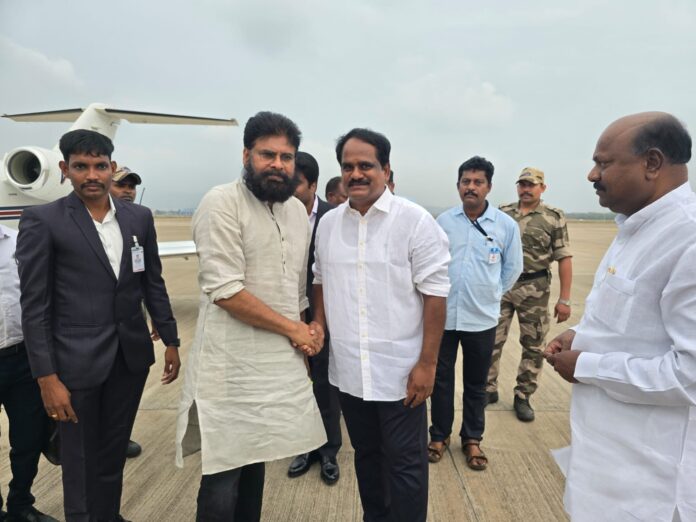 ఆంధ్రా యూనివర్సిటీ శతాబ్ది ఉత్సవాలలో పాల్గొనేందుకు ముఖ్య అతిథిగా విచ్చేసిన ఆంధ్రప్రదేశ్ రాష్ట్ర ఉప ముఖ్యమంత్రి, జనసేన పార్టీ అధినేత పవన్ కళ్యాణ్ కు జనసేన పార్టీ విశాఖపట్నం నగర అధ్యక్షులు, దక్షిణ నియోజకవర్గ శాసనసభ్యులు వంశీకృష్ణ శ్రీనివాస్ విశాఖ విమానాశ్రయంలో ఘన స్వాగతం పలికారు. ఈ సందర్భంగా ఆప్యాయంగా పలకరించిన అధినేతతో పలు అంశాలపై మాట్లాడారు. కార్యక్రమంలో జనసేన పార్టీ రూరల్ అధ్యక్షులు , పెందుర్తి ఎమ్మెల్యే పంచకర్ల రమేష్ బాబు , ఇతర ఎమ్మెల్యేలు పాల్గొన్నారు….