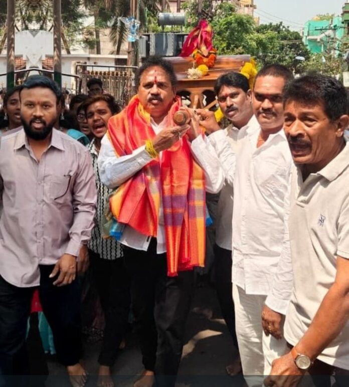 రాష్ట్రంలో దుష్ట పరిపాలనకు విముక్తి జరిగి ప్రజలు కోరుకునే విధంగా మళ్లీ రామరాజ్యం రావాలని వైయస్సార్సీపీ సమన్వయకర్త దక్షిణ నియోజకవర్గ మాజీ ఎమ్మెల్యే వాసుపల్లి గణేష్ కుమార్ అన్నారు*. 33వ వార్డు అల్లిపురం కుమ్మర వీధిలో జరిగిన శ్రీరామనవమి వేడుకల్లో ఆయన ముఖ్యఅతిథిగా పాల్గొని స్వామివారి పల్లకి ఊరేగింపులో భక్తులతో పాటు పల్లకిని ఊరేగించారు. ఈ సందర్భంగా వాసుపల్లి మాట్లాడుతూ ఇచ్చిన మాట తప్పని శ్రీరామచంద్రస్వామి రాజ్యంలో ప్రజలను సుఖశాంతులతో జీవించే వారన్నారు. అలాగే వైసిపి ప్రభుత్వం లలో జగన్మోహన్ రెడ్డి ఇచ్చిన మాటకు కట్టుబడి మడమ తిప్పని ముఖ్యమంత్రిగా ప్రపంచ దేశాలకే ఆదర్శంగా నిలిచి ప్రజలకు సంక్షేమాన్ని అభివృద్ధిని సుపరిపాలనను అందించారని గుర్తు చేశారు. నేడు కూటమి ప్రభుత్వంలో దుష్టసంరక్షణ జరగాల్సిన అవసరం ఉందన్నారు. 33వ వార్డులో ఘనంగా జరిగిన శ్రీ సీతారాముల కళ్యాణం వేడుకల్లో తాను కూడా భాగస్వామి అవ్వడం అదృష్టంగా భావిస్తున్నానన్నారు. దేశవ్యాప్తంగానే కాకుండా ప్రపంచ దేశాలలో కూడా శ్రీరామ నామ సంకీర్తనతో మార్మోగుతున్నాయన్నారు. తమ అధినేత జగన్మోహన్ రెడ్డి కుటుంబానికి శ్రీరాముని ఆశీస్సులు ఎల్లవేళలా ఉండాలని ఆకాంక్షించారు. అలాగే వైఎస్ఆర్సిపి కుటుంబ సభ్యులకు దక్షిణ నియోజకవర్గ ప్రజలకు వాసుపల్లి గణేష్ కుమార్ శుభాకాంక్షలు తెలిపారు. ఈ కార్యక్రమంలో 33 వ వార్డు ప్రెసిడెంట్ ముత్తాబత్తుల రమేష్, మాజీ కార్పొరేటర్ పచ్చిరపల్లి రాము,జిల్లా జనరల్ సెక్రటరీ గణగాళ్ల రామరాజు, వార్డు నాయకులు మహిళ నేతలు స్థానిక మహిళలు అధిక సంఖ్యలో పాల్గొన్నారు.